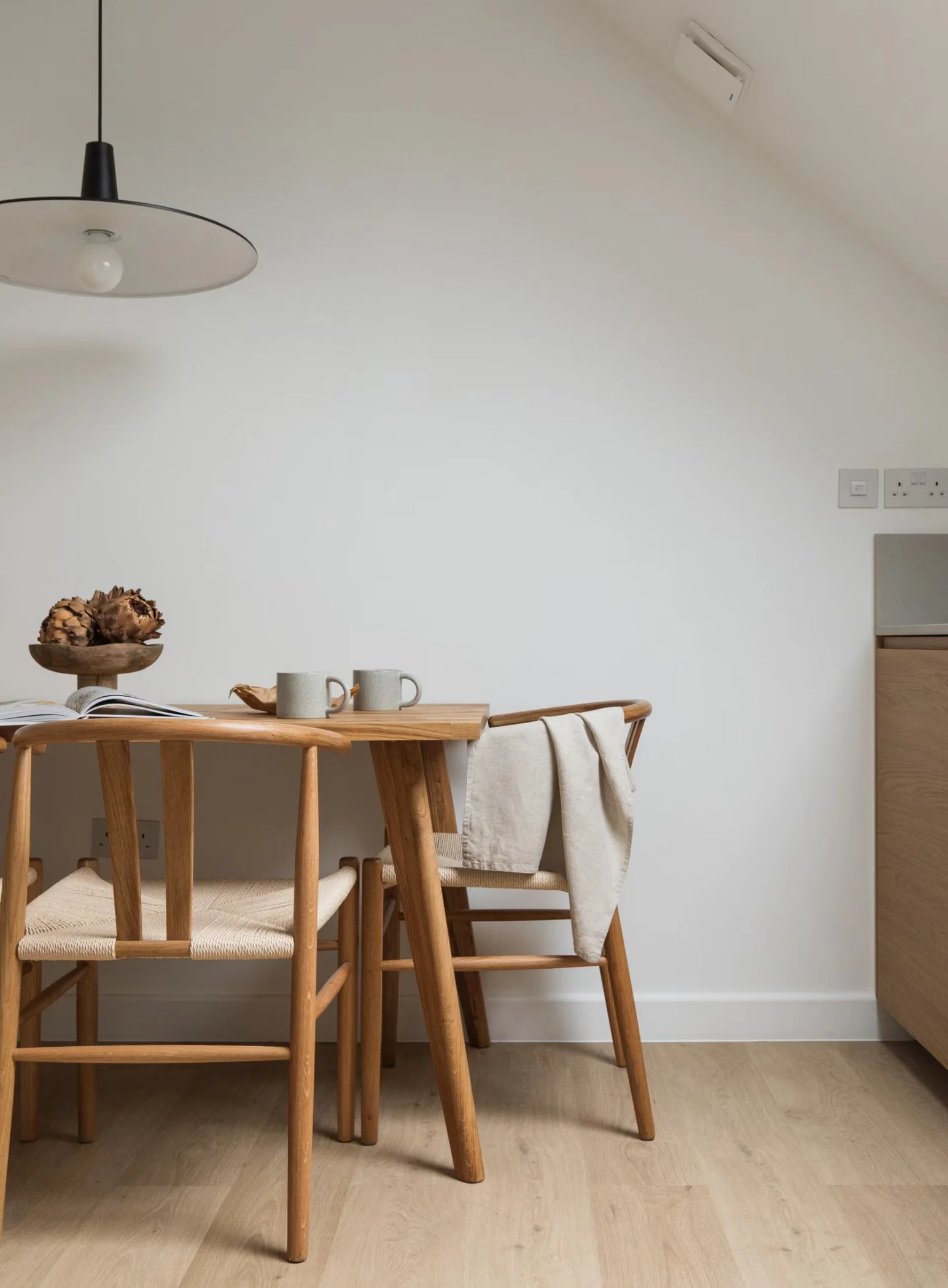 Solid oak tables become both dining and workspace; linen curtains soften the light for late-evening focus.